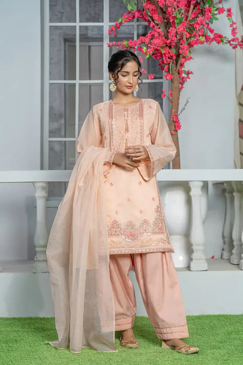 Paired with a flowing Farshi Shalwar, this ensemble offers a beautifully structured silhouette that enhances your presence at weddings, mehndi functions, dinners, and formal gatherings. The soft peach hue radiates subtle charm while the organza fabric adds a premium shine and graceful drape, making this suit a timeless choice for festive and formal occasions.