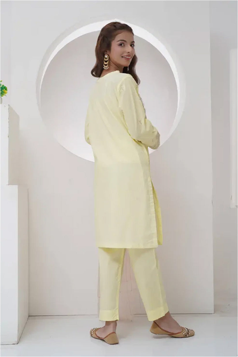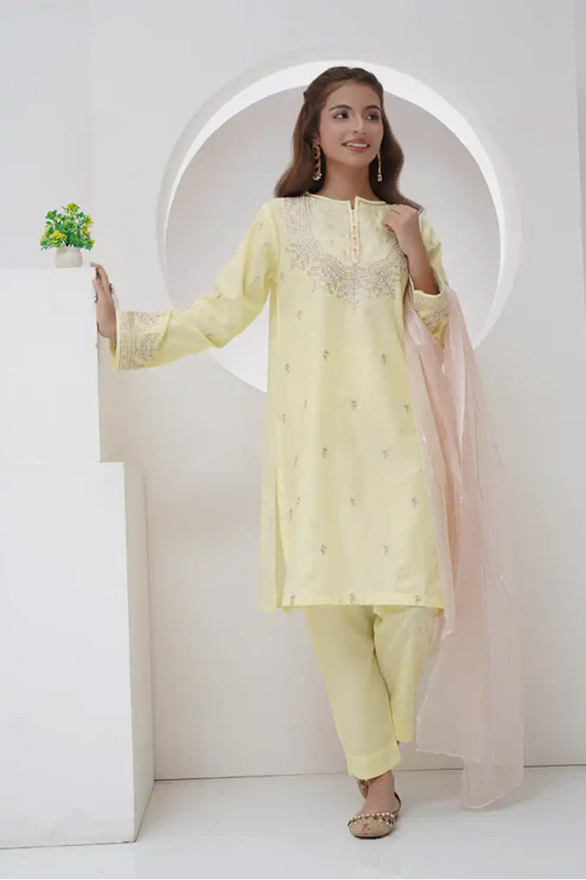 Elevate your ethnic wardrobe with this 3 Piece Embroidered Suit with Organza Dupatta (R-T-SFC-006) — a perfect fusion of understated elegance and modern charm. Crafted from premium cambric lawn fabric with delicate embroidered detailing, this ensemble brings timeless grace to all your festive and semi-formal occasions. The soft pastel yellow shirt is beautifully paired with matching trousers for a harmonious look, while the light organza dupatta adds a touch of ethereal sophistication to the outfit.