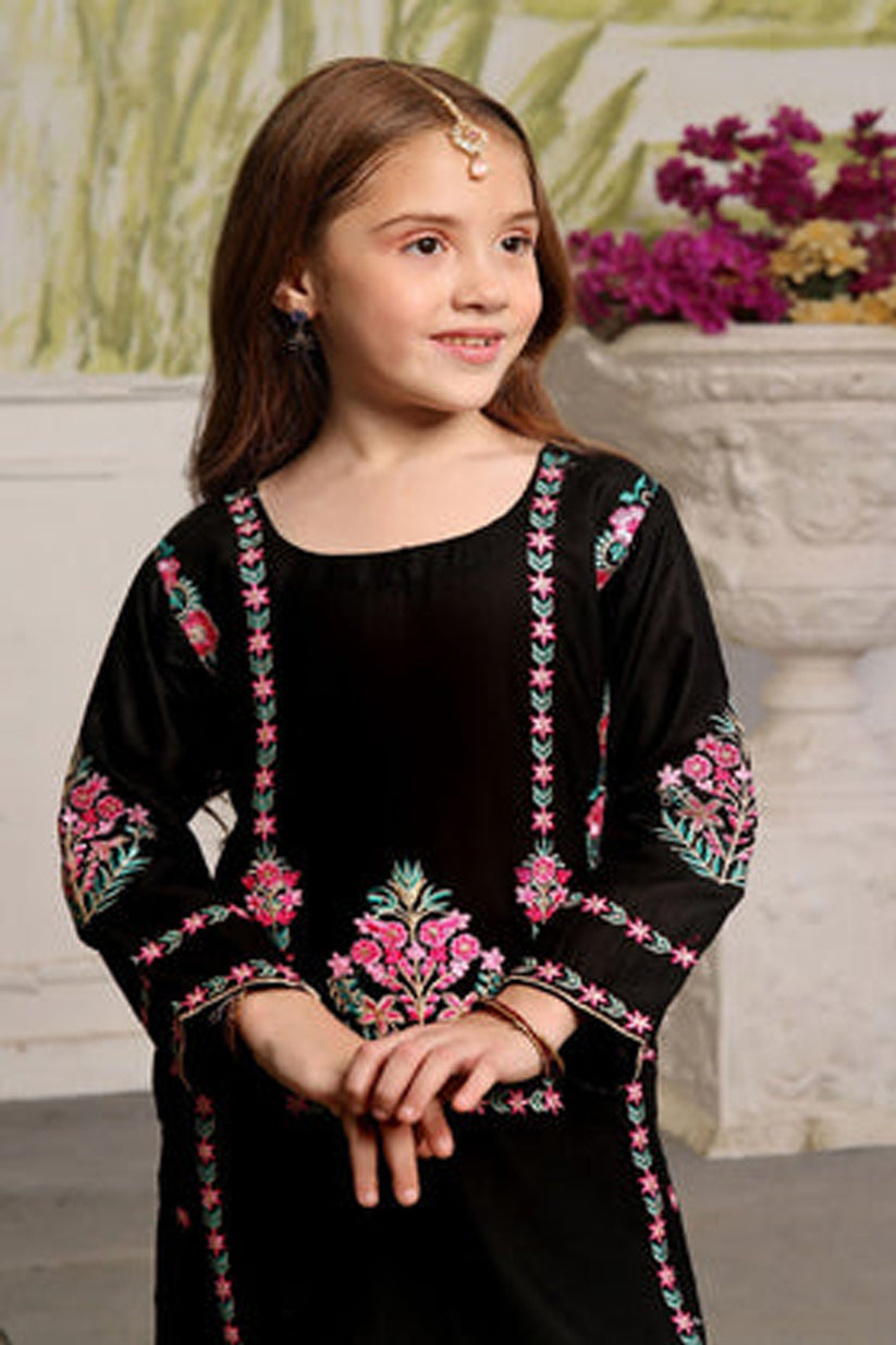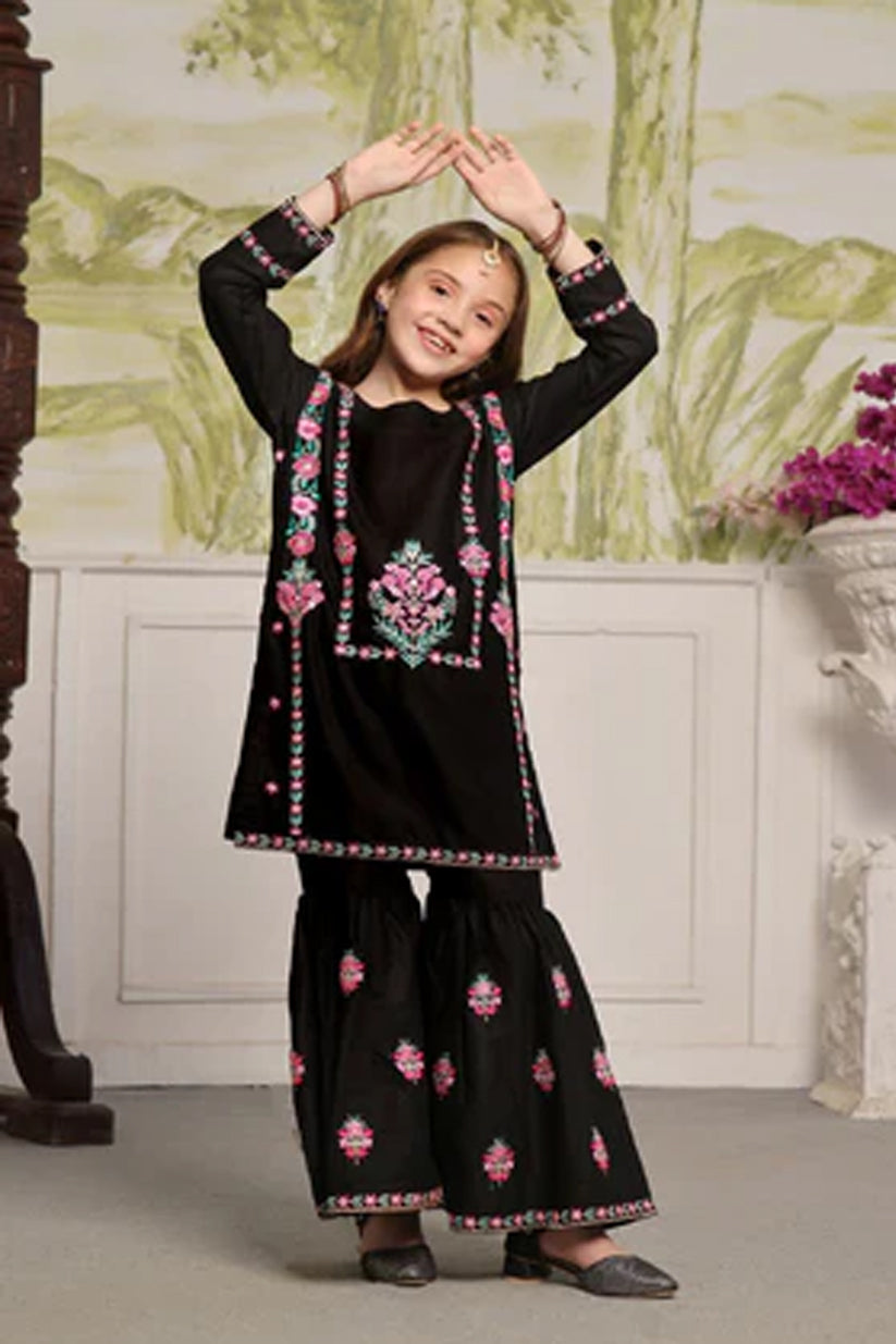 Dress her in effortless style with the Kajal-17 Black Cotton Gharara Set, a chic and comfortable outfit designed for festive moments and everyday wear. Made from soft cotton and lawn fabric, this 2-piece set features a beautifully embroidered top paired with a straight-leg gharara bottom that offers both comfort and movement.